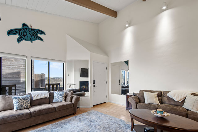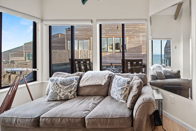 A wonderful front row, ocean view value at the Surf Way condos. Watch the dolphins as you drink your coffee in the morning. There are ocean views from every room of this remodeled unit; one from the living room, and a views of Monterey Harbor from both bedrooms. Elevated a bit higher than most of the other units, this home affords more privacy than typically available in the complex. Excellent light and soaring ceilings in the living room provide a calm sanctuary to listen to the sound of crashing waves. There is a washer/dryer in the home, one garage and one dedicated covered parking space. An additional dedicated storage area is ready to house your boogie boards, beach chairs and bikes. A community pool and gym are also offered, as is a second community laundry facility. This home is available turnkey. Nothing beats living on the sand!